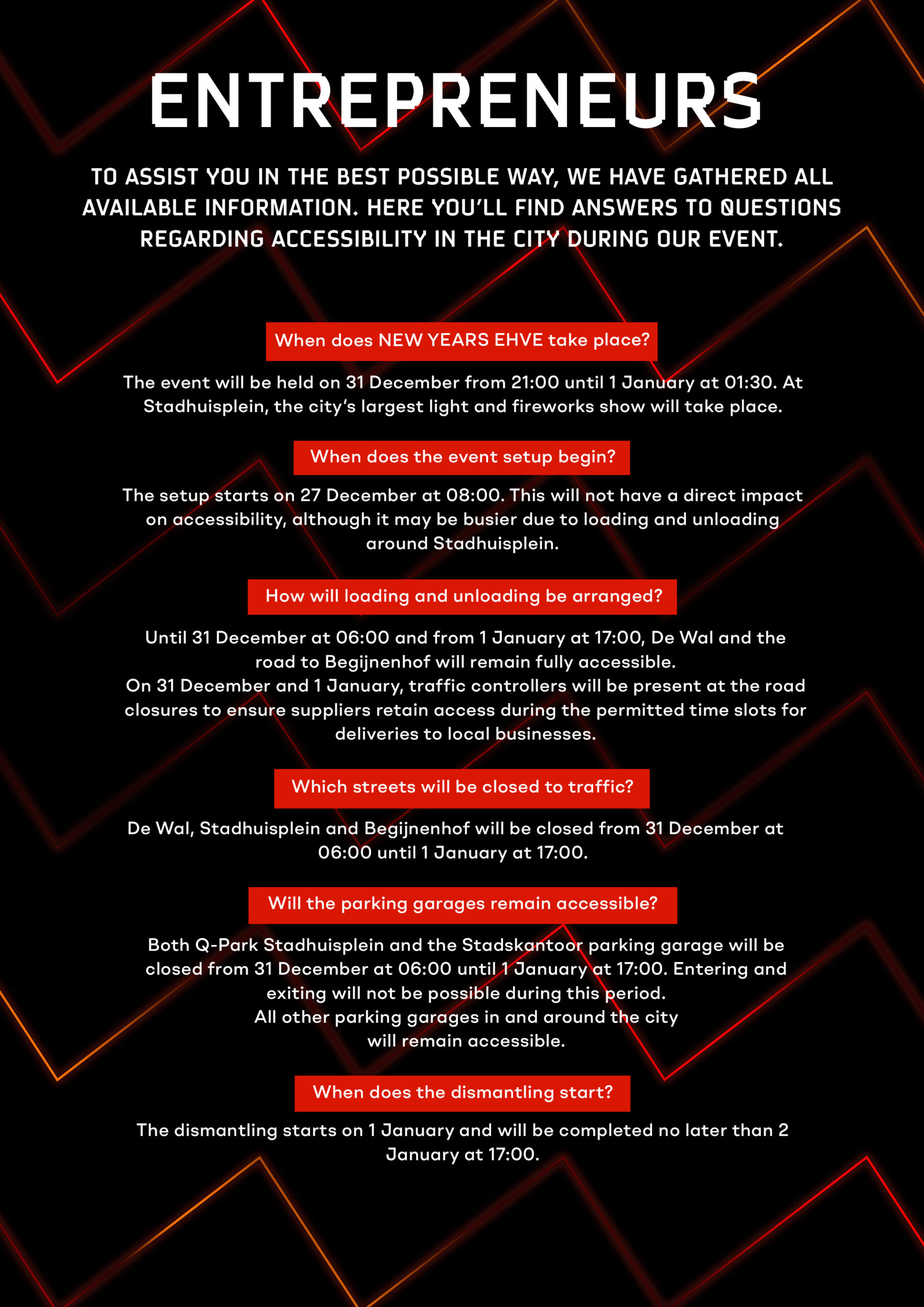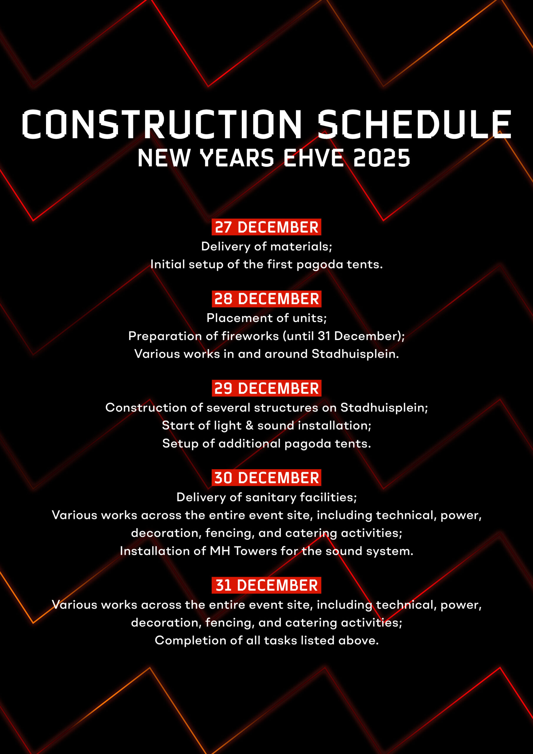 As a proud city, we would like to involve all entrepreneurs of Eindhoven in this unique event. New Years EHVE is not only a celebration for residents, but also an opportunity for all of us to work together and make our city shine. We will keep you informed of all available information through this page. This concerns the construction schedule, the map of the site, where you can go with complaints, and the possibilities to promote your own initiative via our website.