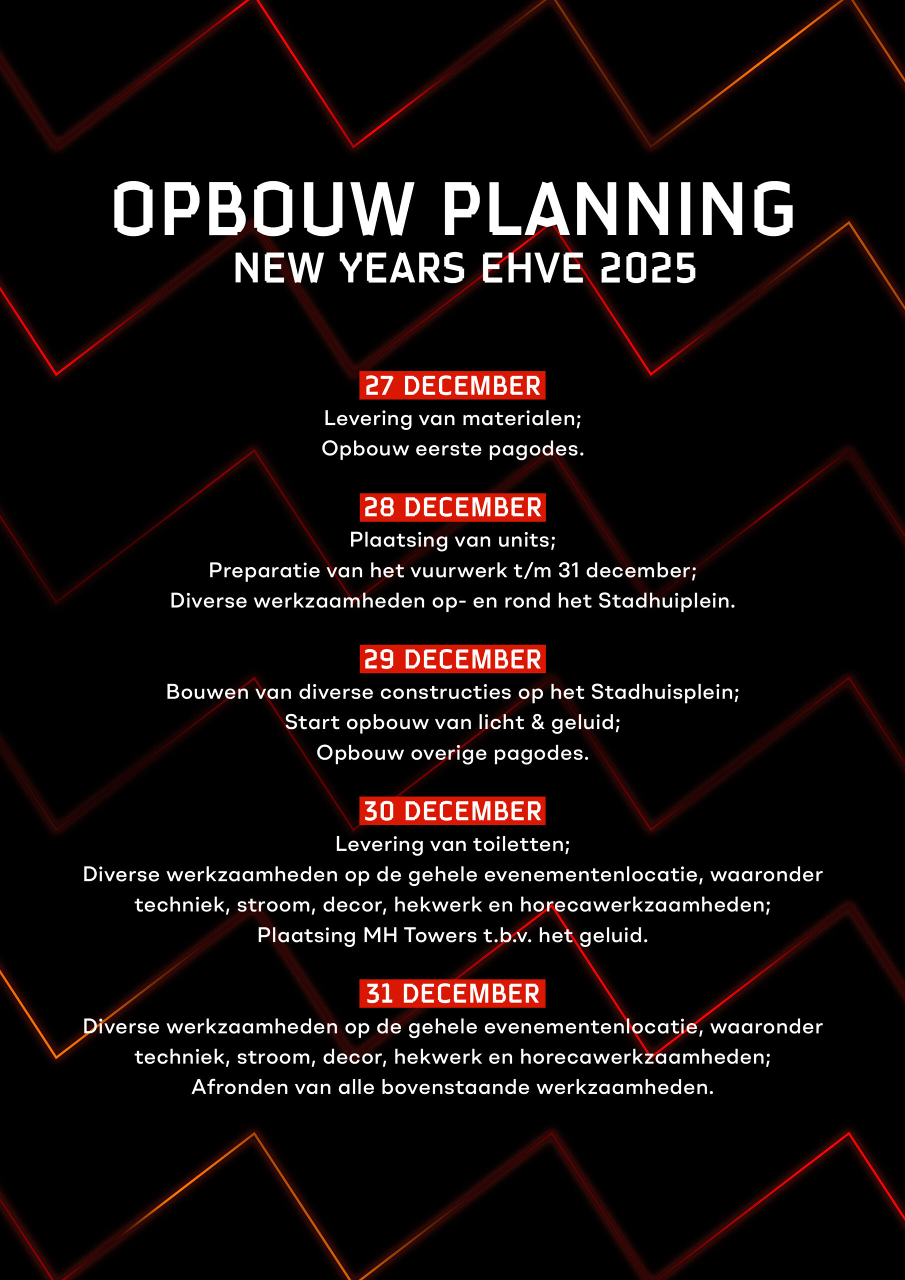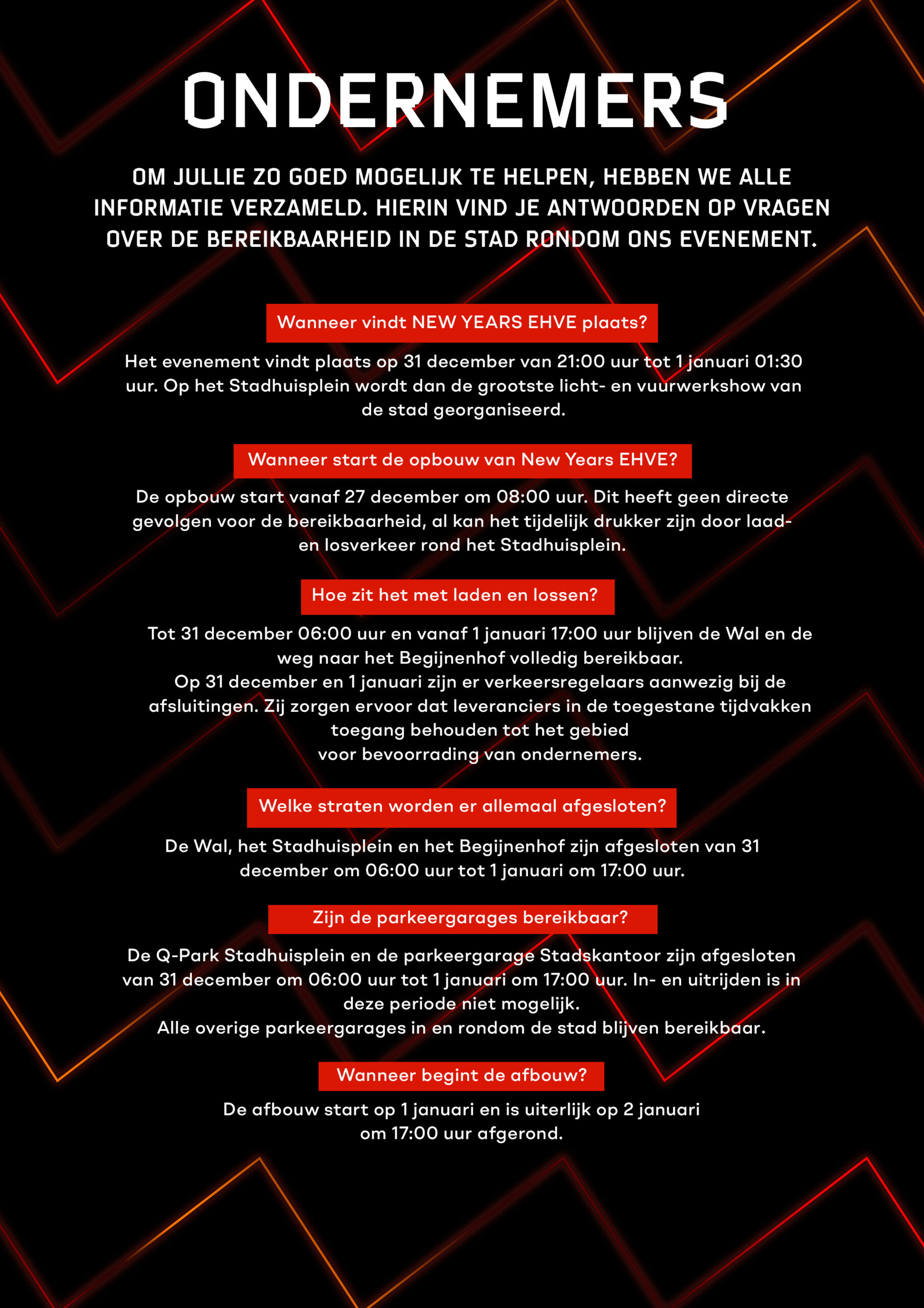 Als trotse stad willen we graag alle ondernemers van Eindhoven betrekken bij dit unieke evenement. New Years EHVE is niet alleen een feest voor de inwoners, maar ook een kans voor ons allemaal om samen te werken en onze stad te laten stralen. Via deze pagina houden we jullie op de hoogte van alle informatie die beschikbaar is. Dit betreft het opbouwschema, de plattegrond van het terrein, waar jullie terecht kunnen met klachten, en de mogelijkheden om jullie eigen initiatief via onze website te laten promoten.